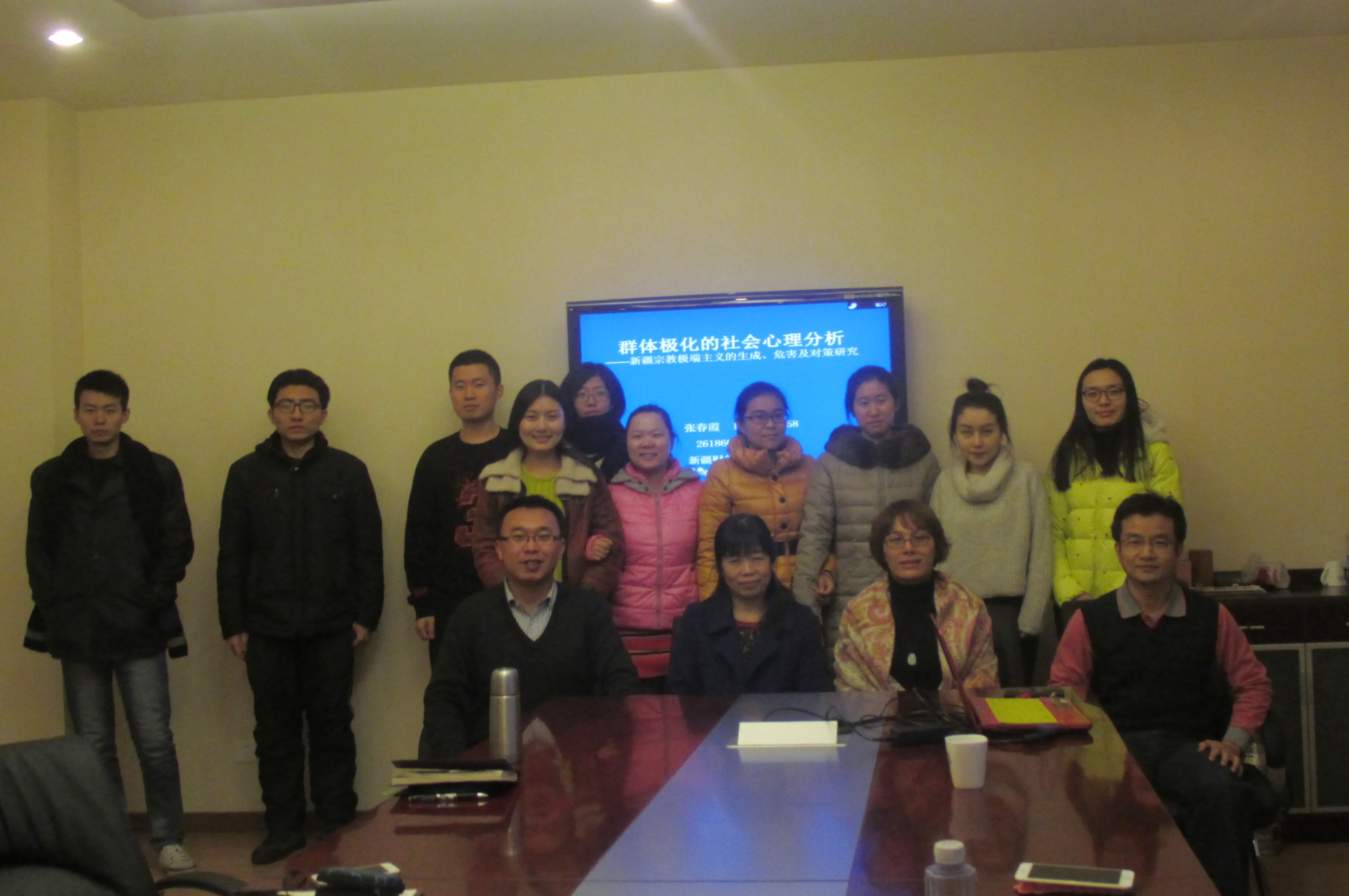 2014年12月16日下午,公司第70期人文社科论坛暨第16期马克思主义论坛在中心教学楼1302室举行。本次论坛由新疆财经大学马列部张春霞副教授主讲“群体极化的社会心理分析——新疆宗教极端主义的生成、危害及对策研究”。马克思主义学院副经理李林英教授、人文公司党委书记娄秀红、陈宗海教授、张雷老师以及马克思主义理论专业硕士研究生参加了本次论坛。论坛由张雷老师主持。