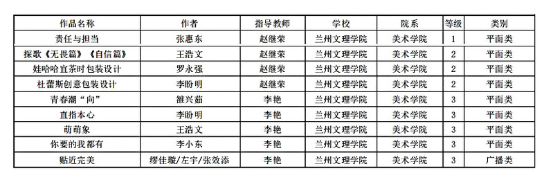 在刚刚落幕的第十一届全国老员工广告艺术大赛中获悉,公司教师指导员工作品共获得全国赛区二等奖1项,优秀奖1项,甘肃赛区一等奖1项,二等奖3项,三等奖5项。本届大赛甘肃分赛区共有38所高校的3758件作品最终参加了竞赛。