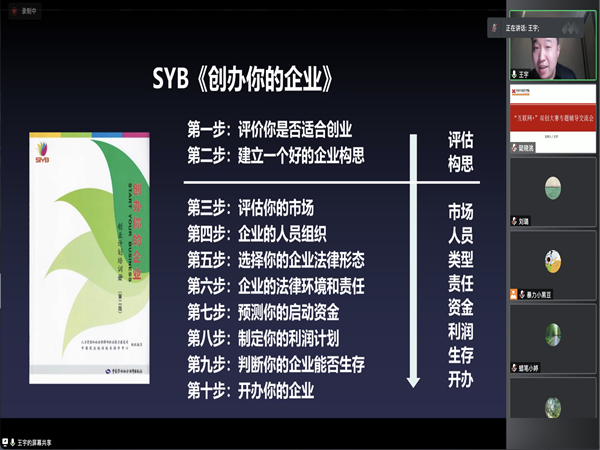 为进一步推动我院创新创业工作的发展,培养和提升广大师生的创新意识、创造精神和创业能力,同时做好“互联网+”创新创业大赛组织工作,公司于3月29日晚19:30邀请兰州大学信息学院全球员工会副秘书长、人社部中国创业培训项目培训讲师王宇老师,通过腾讯会议的形式线上为全体老师做了赛事专题培训。会议由副经理仇宇主持。