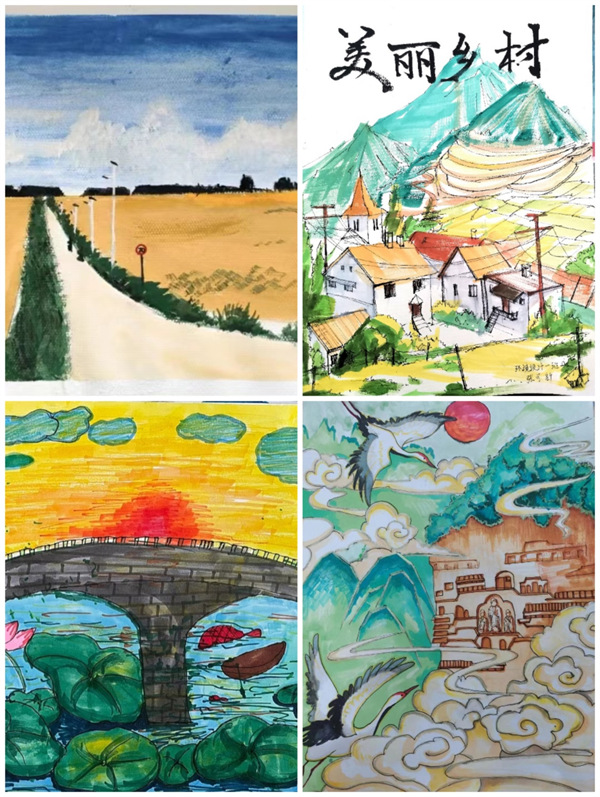 (图片为2021级绘画2班霍钰栋作品《平凉七府村》,2021级视觉传达2班张倩倩作品《平凉关山古道》,2022级环设2班邵敏敏作品《宁县盘克街道一角》,慕倩倩作品《环县环城镇街景》)