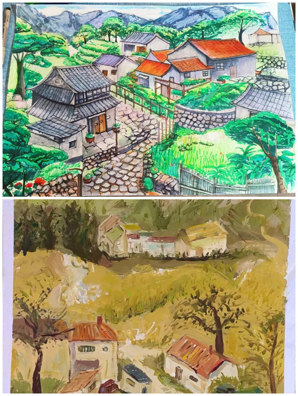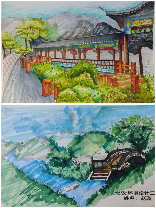 (图片为2022级环设2赵璇作品《我的家乡陇南市武都区两水镇》,2022级环设2李佳乐作品《我的家乡陇南市文县河口村》
