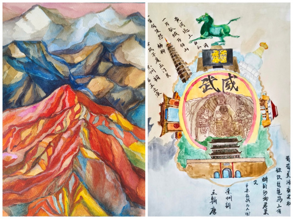 (图片为2022级绘画专业马钰烨作品《七彩丹霞》、2022级绘画专业龚新佳作品《绘美凉州---武威》)