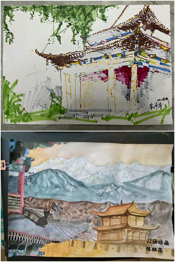 (图片为2022级绘画专业李泽清作品《绘美凉州---鸠摩罗什寺塔一角》,2022级绘画专业陈桃花作品《天下第一雄关嘉峪关》)
