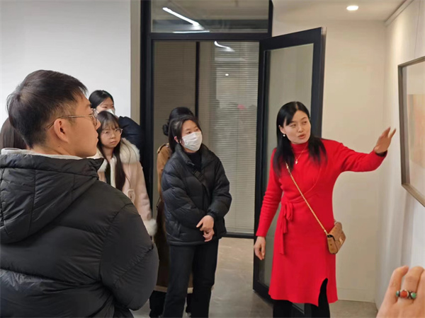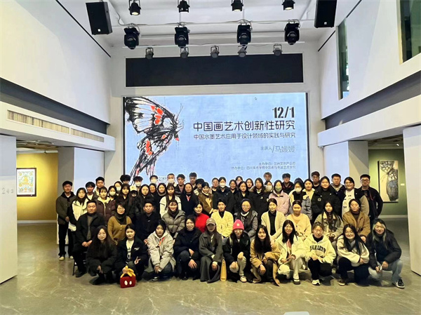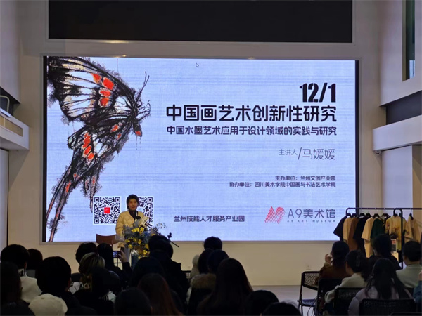 为熏陶设计专业员工的艺术素养,开拓同学们的设计思维能力,12月1日下午,yl23411永利集团官网视觉传达设计专业30名同学到兰州文创产业园A9美术馆聆听了当代彩墨艺术家马媛媛老师关于《中国画艺术创新性研究》的讲座,并现场观看了马媛媛老师的个人绘画作品及《化蝶》系列相关文创产品。