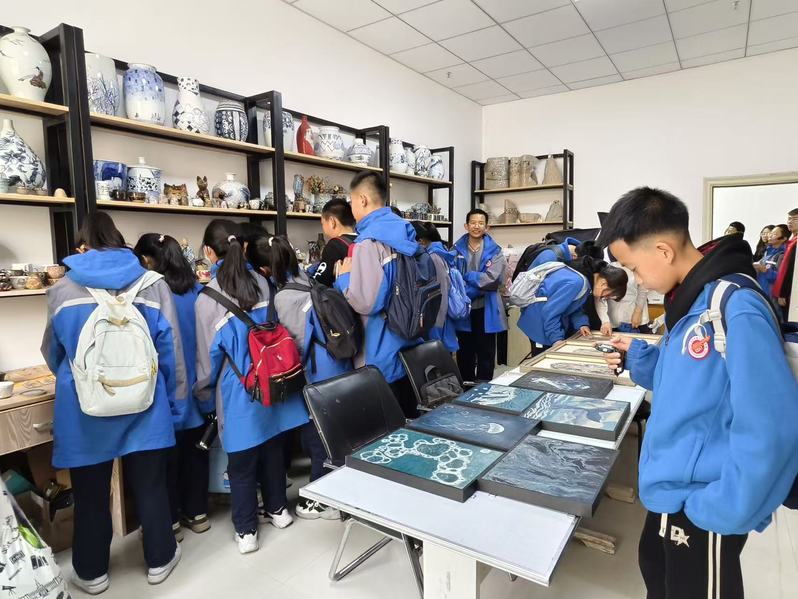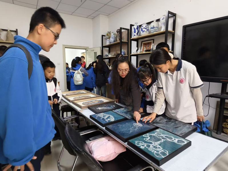 随后,在支部员工党员的带领下研学一行还参观了陶艺和纤维工作室。过程中,同学们欣赏到了许多优秀的陶艺、扎染和掐丝作品,这些作品以其独特的造型、图案、精细的线条和丰富的色彩,展现了传统工艺的独特魅力与无限可能。来访的中员工们对这次参观活动表现出了极大的热情与兴趣,在现场与公司的党员同学们也展开了热烈的交流。