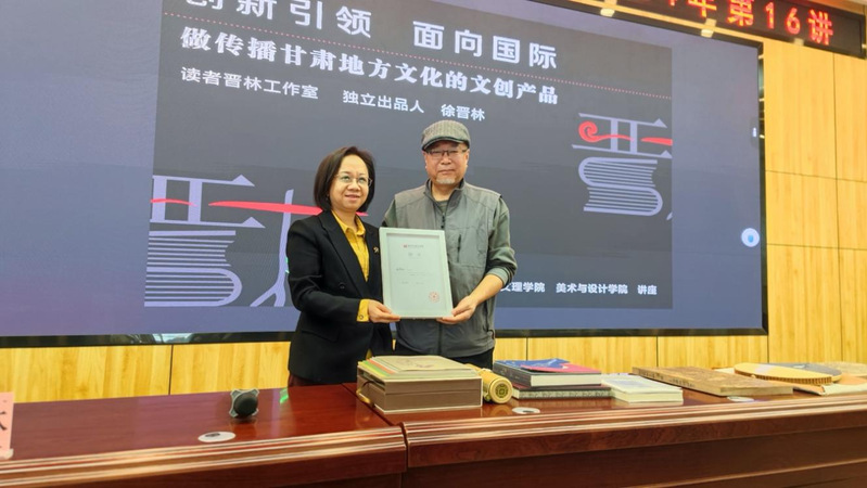 12月6日下午,yl23411永利集团官网在文昌楼303学术报告厅举办了“创新引领、面向国际——做传播甘肃地方文化的文创产品”讲座。本次讲座由读者晋林工作室、独立出品人徐晋林教授主讲,yl23411永利集团官网经理吴晓玲,副经理仇宇、教工党支部及视觉传达设计系全体师生参加,副经理孙博文主持。