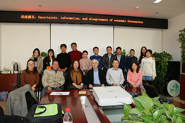 Soofi教授的讲座围绕经济预测者的不确定性和不一致性问题展开,指出使用专业预测员调查(SPF)美国就业率的个体动态性及总体不确定性,进而在密度预测混合模型上建立信息框架。随后,Soofi教授详细介绍了其利用贝叶斯等级模型来检验不确定性与预期趋势、点预测离差之间的关系,并基于方差和Dirichlet模型建立信息框架,用于捕捉经济变量概率分布不确定性。讲座结束后,参加论坛的老师和同学们与Soofi教授进一步探讨了其理论模型、创新之处及需要突破的难点等。