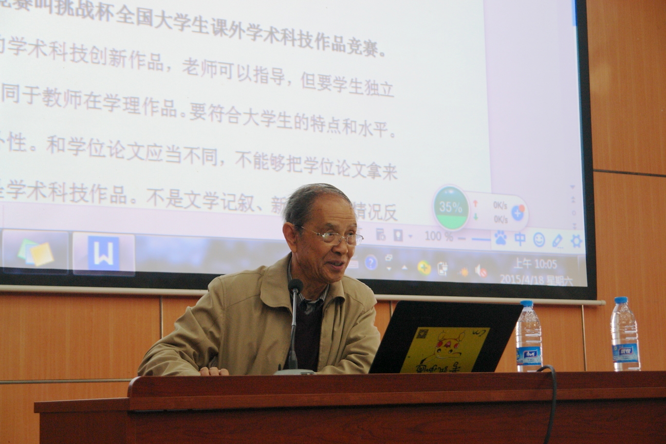 4月18日,永利官网2015员工课外科技创新周系列活动-----“如何写好挑战杯社科类作品”讲座在综教报告厅顺利举行。全国“挑战杯”竞赛组委会常务副主任,原教育部社科司司长奚广庆教授应邀来校座谈。活动由3044AM永利集团官网承办,吸引了来自人文学院、管理学院、法学院、外国语学院等多个文科学院员工的参与。