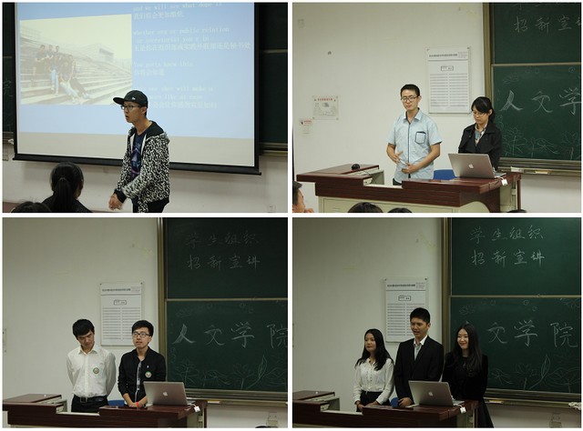 开场视频结束后,宣讲正式开始。人文学院团委、新闻宣传中心、学术实践中心、共学会、青年志愿者协会、员工会六大组织的部长们依次登场,进行自己组织及部门的宣讲。其中,团委的樊涛部长给大家带来了自己编曲、自己作词的说唱乐,瞬间引爆会场;新闻宣传中心则以一个制作精良的视频吸引全场;学术实践中心的学霸部长们则发了贴心的糖果;共学会的宣讲逻辑清晰、虽“红专”但不单调枯燥;青协则以自己大爱无私的志愿精神温暖感动了所有在场的同学与老师;员工会的部长们则以优雅大方的精神面貌和充满激情的演讲给宣讲会画上了一个圆满的句号。宣讲结束后,大一的同学们在现场询问了员工组织的一些情况,填写并提交了报名表。