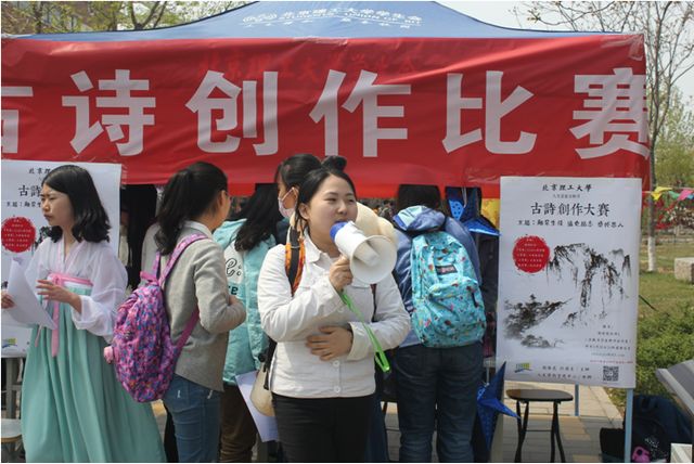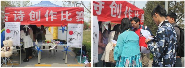 2016年4月11日中午,由教务处与共青团永利官网委员会主办,人文学院学术实践中心承办的古诗创作比赛外场在北食堂外场顺利举办。本次外场活动旨在进一步宣传人文素养月及古诗创作比赛,同时推动同学们积极参与活动,提升自我的文化内涵。