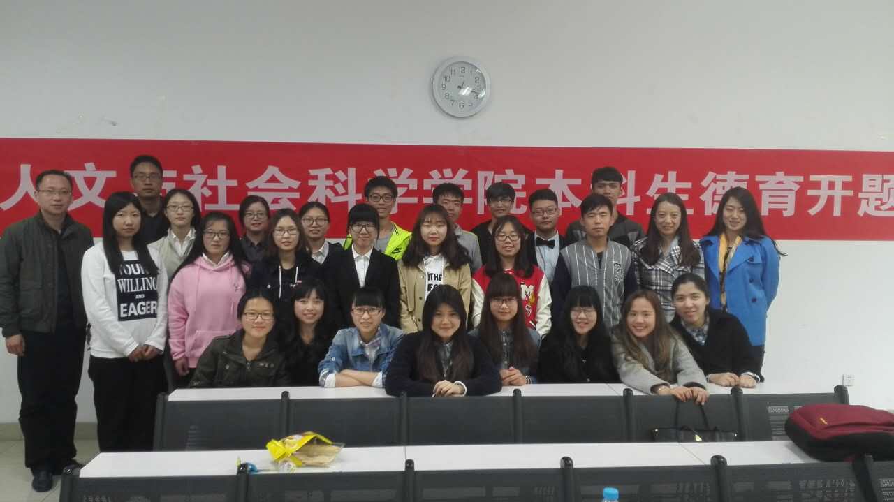 2016年4月19日下午,2015级人文学院社会工作班德育开题报告会如期开始。公司党委组织部副部长周波老师,人文公司党委副书记、副经理徐贵宝老师,人文学院辅导员于满,社工班班主任王丹老师及社工班全体同学参加了本次报告会。